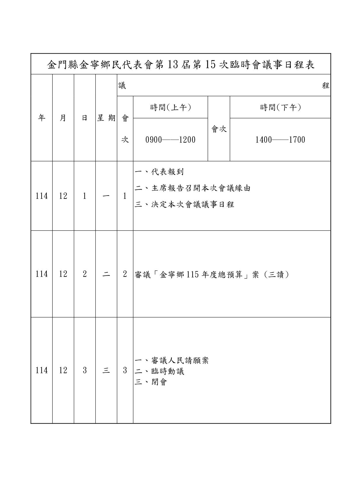 第13屆第15次臨時會(114年12月1日至114年12月3日)